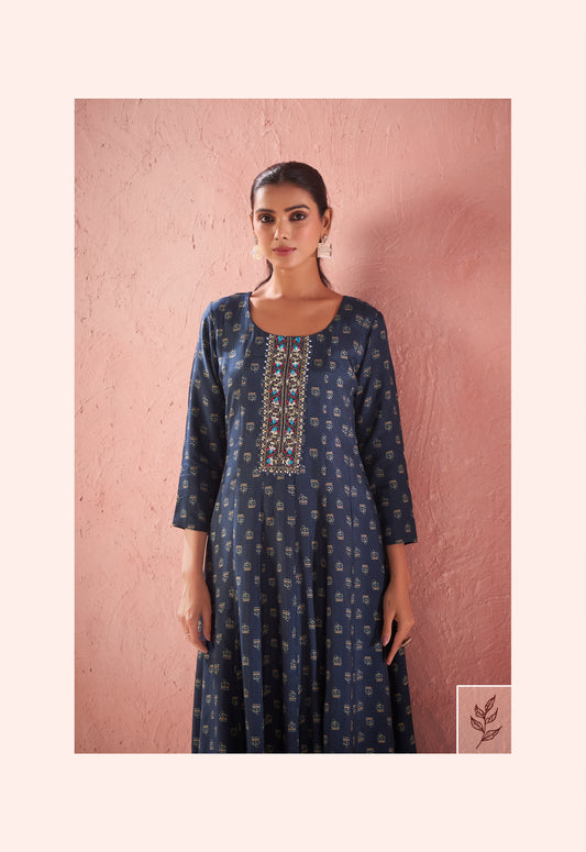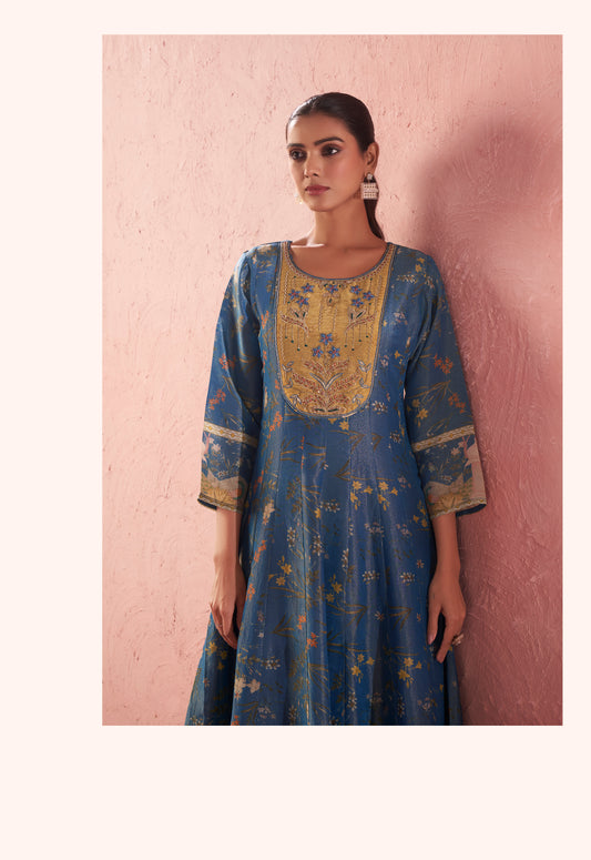 Regular price Rs. 7,995.00Regular priceUnit price / perSale price Rs. 7,995.00Step into timeless elegance with Adhira – Midnight Indigo, a majestic Anarkali dress designed to make a lasting impression. Crafted from premium Muslin fabric, this full-length ensemble features detailed handwork embroideryenhanced by captivating digital prints. The deep midnight indigo hue evokes a sense of mystery and grace, making it a perfect choice for evening events, festive occasions, and weddings.