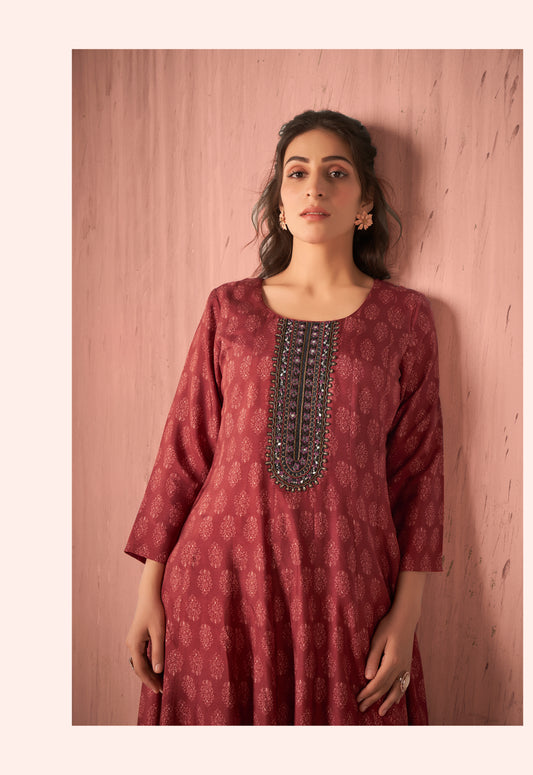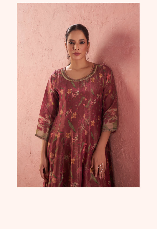 Regular price Rs. 9,995.00Regular priceUnit price / perSale price Rs. 9,995.00Step into timeless elegance with Aarambh – Rosewood Bloom, a stunning handcrafted Anarkali gown in a rich rosewood hue. Designed for the modern woman who values tradition, this luxurious ensemble showcases fine hand embroidery and vibrant floral digital prints on a soft shimmer tissue fabric that flows effortlessly with every move.