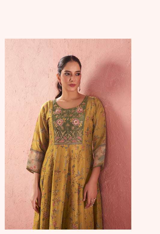 Regular price Rs. 9,995.00Regular priceUnit price / perSale price Rs. 9,995.00Radiate warmth, joy, and effortless charm with Aarambh – Golden Hour, a stunning handcrafted Anarkali gown in a radiant mustard yellow hue. Made from premium shimmer tissue fabric, this designer piece combines meticulous hand embroidery with vivid floral digital prints, making it the perfect outfit to shine during daytime festivities and golden-lit celebrations.