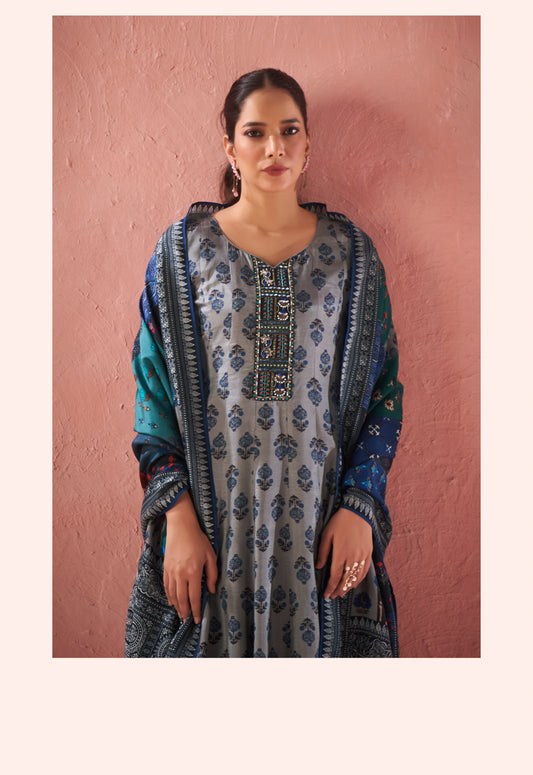 Regular price Rs. 7,995.00Regular priceUnit price / perSale price Rs. 7,995.00Radiate serene elegance with Moonstone Grace, a mesmerizing Anarkali dress inspired by the soft shimmer and timeless beauty of moonlight. Crafted from premium Muslin fabric, this exquisite ensemble features delicate hand embroideryand refined digital prints, coming together in a soothing palette reminiscent of moonstone hues. Perfect for intimate celebrations, festive evenings, and occasions where subtle sophistication is key.