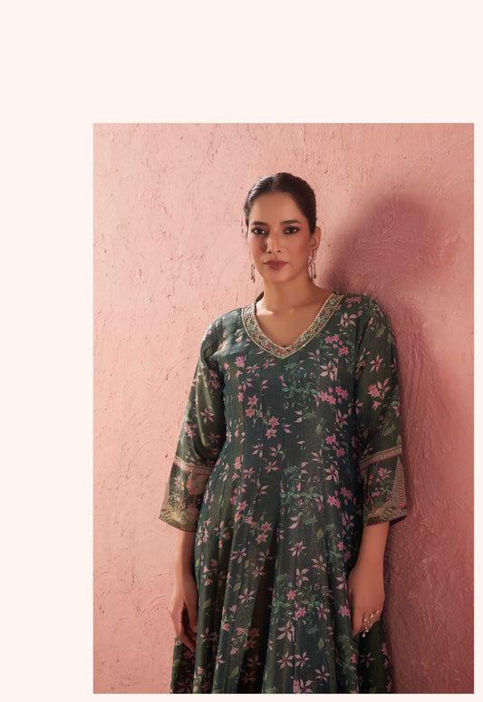 Regular price Rs. 9,995.00Regular priceUnit price / perSale price Rs. 9,995.00Inspired by the richness of nature and the artistry of tradition, Aarambh – Forest Muse is a premium Anarkali gown that exudes depth, elegance, and grace. Crafted from high-quality shimmer tissue, this designer piece features detailed hand embroidery paired with bold multicolor digital prints over a regal forest green base — a perfect balance of earthy charm and royal aesthetics.