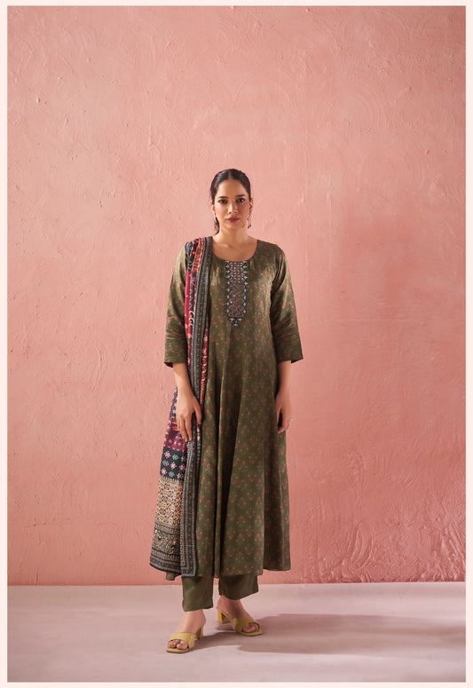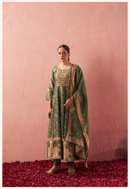 Regular price Rs. 9,995.00Regular priceUnit price / perSale price Rs. 9,995.00Elevate your ethnic wardrobe with Aarambh – Olive Elegance, a regal Anarkali gown designed for women who appreciate heritage craftsmanship and timeless fashion. Made from premium shimmer tissue fabric, this elegant ensemble features detailed hand embroidery paired with a nature-inspired digital print, all in a soothing and royal olive green palette.