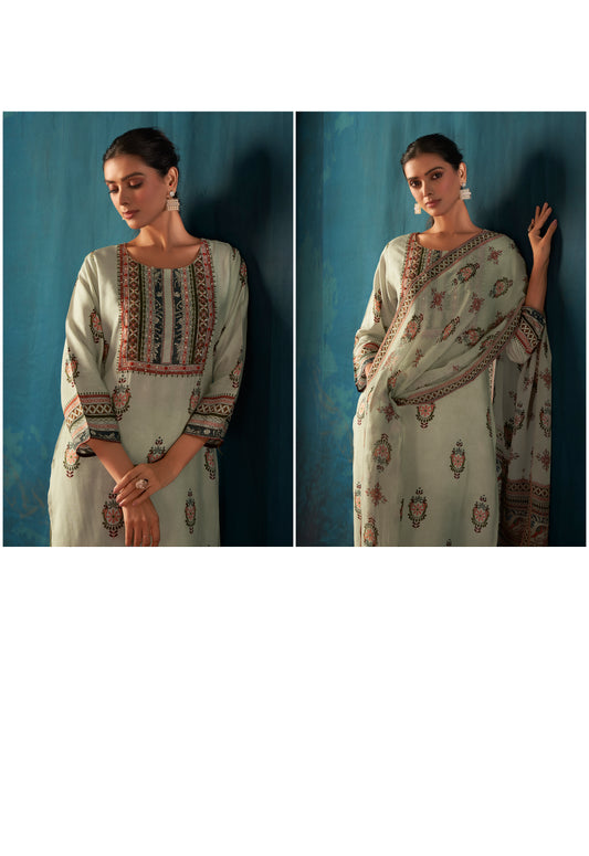 Regular price Rs. 4,995.00Regular priceUnit price / perSale price Rs. 4,995.00Step into serene sophistication with Chaavi – Sage Bloom, a tranquil blend of earthy charm and refined design. This straight-cut kurti in a soft sage tone is made from premium Dola silk, adorned with delicate hand embroidery and graceful digital prints. The perfect ensemble for intimate gatherings, cultural moments, or a poised day look.