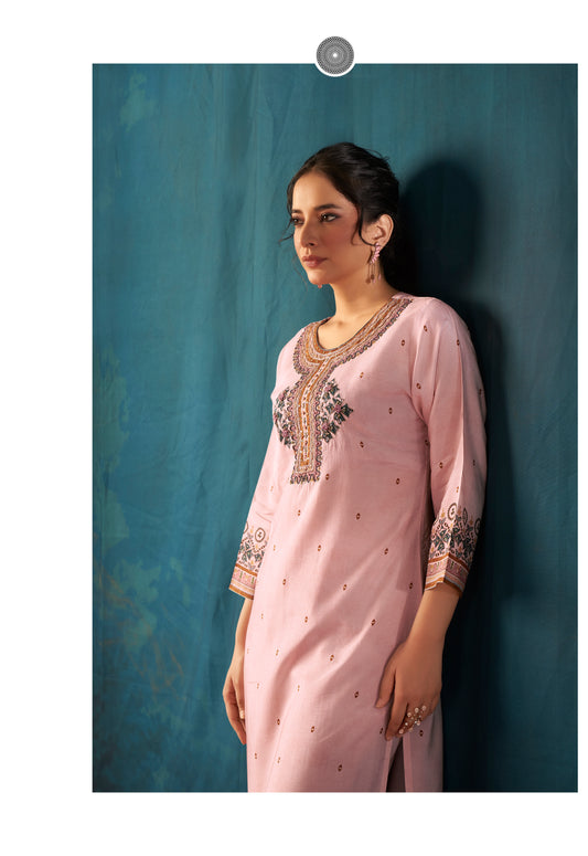 Regular price Rs. 4,995.00Regular priceUnit price / perSale price Rs. 4,995.00Blush with elegance in Chaavi – Blush Rose, a romantic straight-cut kurti that speaks of soft femininity and charm. Crafted with luxurious Dola silk, and finished with handcrafted embroidery and stunning digital motifs, this piece adds a graceful touch to every occasion.