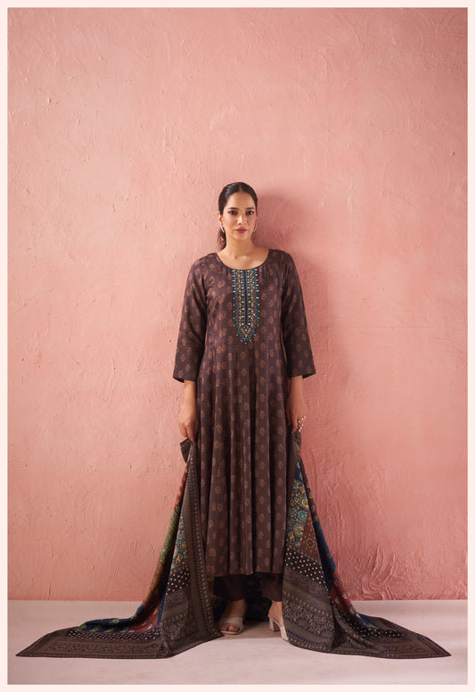 Regular price Rs. 7,995.00Regular priceUnit price / perSale price Rs. 7,995.00Elevate your ethnic wardrobe with Adhira – Cocoa Royale, a graceful Anarkali dress crafted from premium Muslin fabric. Adorned with exquisite handwork and elegant digital prints, this full-length masterpiece blends traditional charm with contemporary sophistication. The rich cocoa hue adds a regal touch, making it perfect for festive occasions, weddings, and cultural celebrations.
