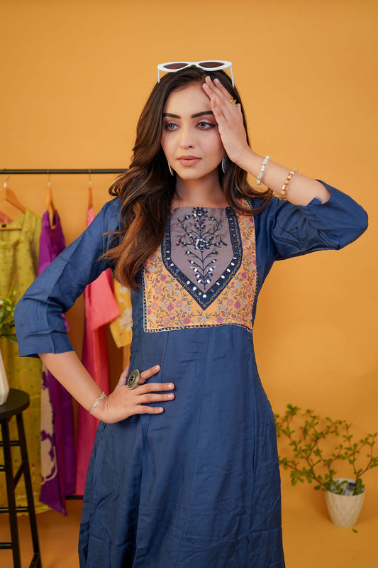 Make a statement with this captivating Blue Pure Muslin set, adorned with stunning Gaji Pach Mirror Work. Designed for those who appreciate intricate craftsmanship, this ensemble is perfect for festive occasions, weddings, and special celebrations.
