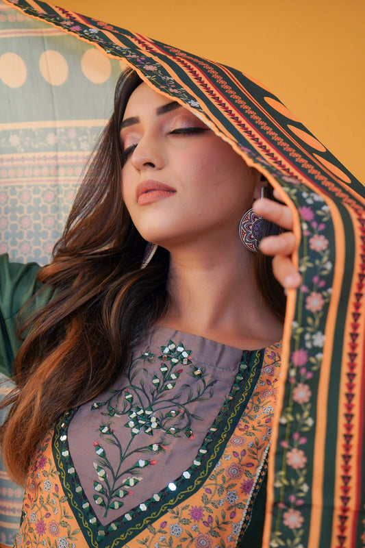 Embrace elegance with this stunning Green Pure Muslin set, adorned with captivating Gaji Pach Mirror Work. Crafted for festive occasions and special events, this ensemble is the epitome of sophistication and style.